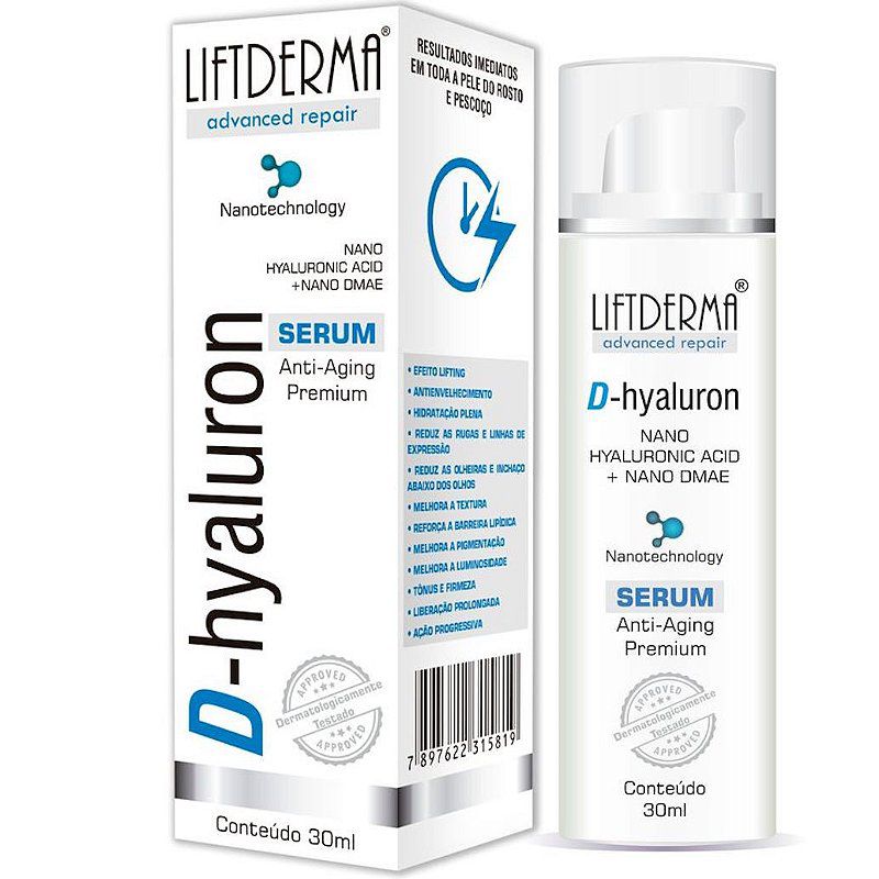 Liftderma D-hyaluron é um Serum Anti-Aging Premium Nanotecnológico que combina o mais puro Nano Ácido Hialurônico (AH) e Nano Dmae (Dimetilaminoetanol Bitartarato) . Por possuir nanopartículas, seu poder de hidratação é mais eficaz. Auxilia o processo natural de renovação da pele de dentro para fora, melhorando o tom e a aparência. O DMAE firma a pele de modo acumulativo, restaurando e tonificando os músculos de toda área hidratada. Sua textura e fragrância leve e não oleosa, acalma a pele deixando-a fresca e macia. Suaviza linhas faciais e rugas, sendo ótimo para uma cobertura facial completa.